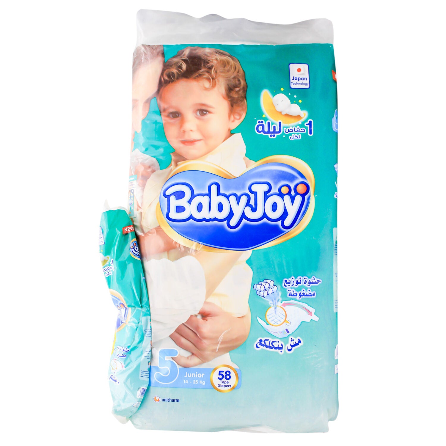 حفاضات بيبي جوي جونيور مقاس 5 توفر امتصاصًا فائقًا وراحة للأطفال الذين يتراوح وزنهم بين 14 و 25 كجم، مصممة للجفاف والحماية من التسرب.