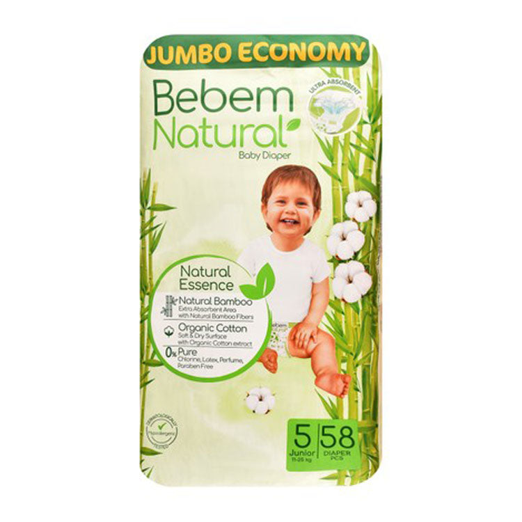 حفاضات أطفال جونيور لا تسبب الحساسية بخلاصة الخيزران، مصممة للبشرة الحساسة، خالية من اللاتكس والبارابين والعطور، توفر الراحة والحماية.