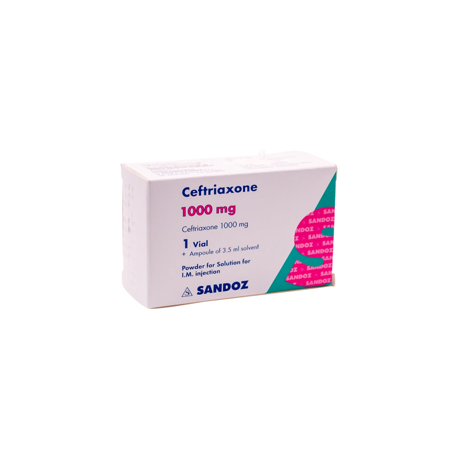 قارورة مسحوق سيفترياكسون 1000 ملغ مع أمبولة مذيب للحقن العضلي