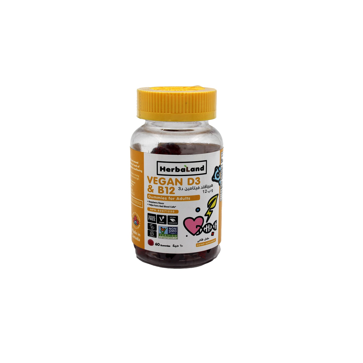 مكملات هيربالاند على شكل حلوى بنكهة التوت، تحتوي على 25 ميكروغرام من فيتامين د3 و850 ميكروغرام من فيتامين ب12، لتحفيز إنتاج خلايا الدم الحمراء - نباتية، خالية من السكر، خالية من الغلوتين