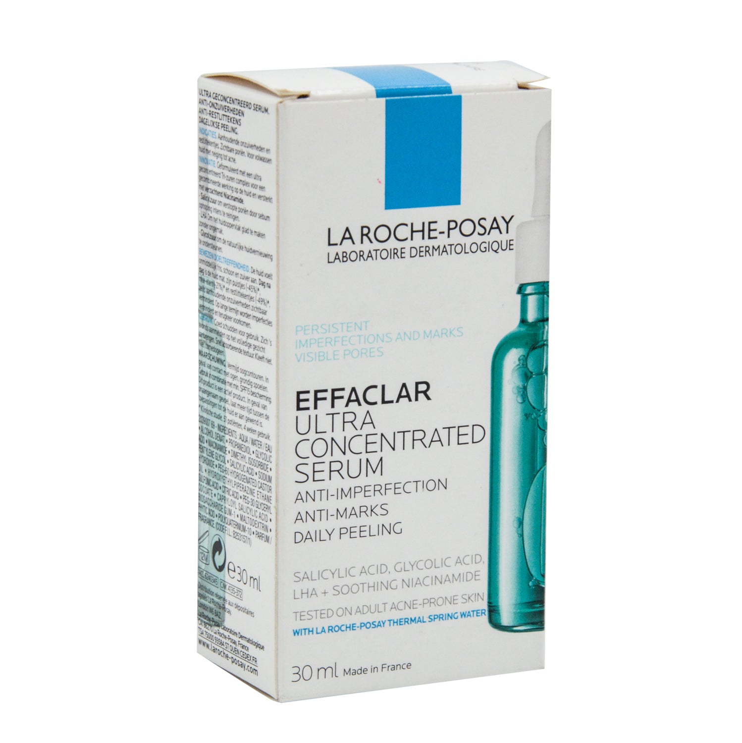 سيروم للوجه غير مسبب للانسداد من مجموعة إيفاكلار من لاروش بوزيه، بتركيبة تحتوي على حمض الساليسيليك، وحمض الجليكوليك، والنياسيناميد لتقليل العلامات والعيوب من خلال مفعول التقشير.