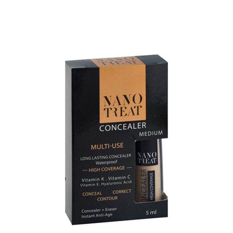 خافي عيوب نانو تريت المقاوم للماء، عالي التغطية، مضاد للشيخوخة، غني بالفيتامينات وحمض الهيالورونيك، مناسب لجميع أنواع البشرة، درجة متوسطة - خالٍ من البارابين، لم يُختبر على الحيوانات، خالٍ من السيليكون