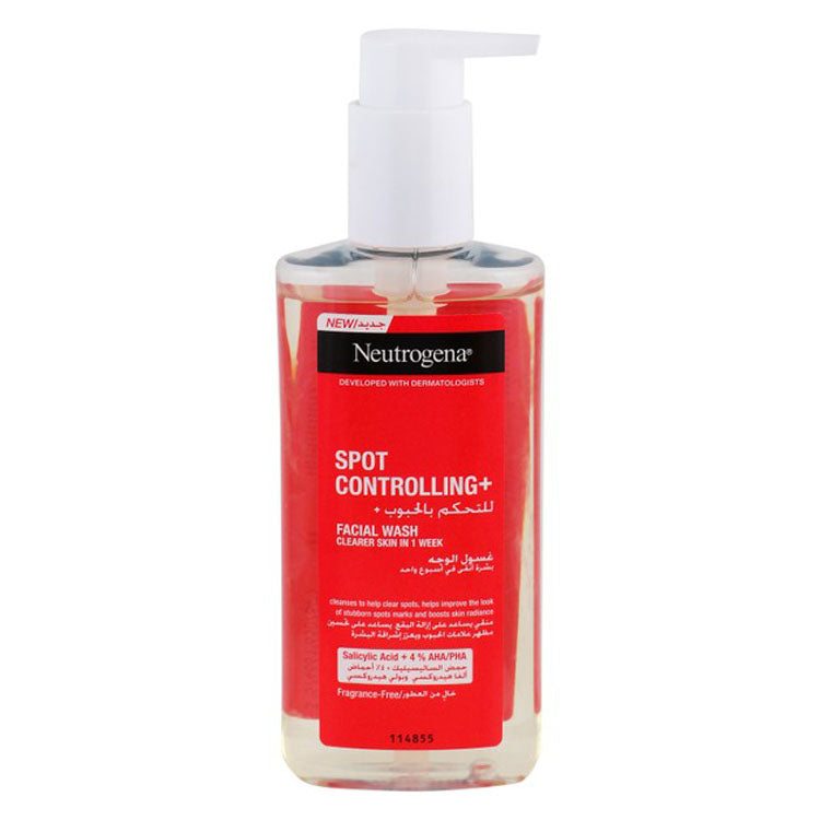 غسول الوجه نيتروجينا للتحكم في البقع وتنظيف البشرة، يحتوي على 4% من أحماض ألفا هيدروكسي، وأحماض بولي هيدروكسي، وحمض الساليسيليك - خالٍ من العطور والزيوت، ولا يسد المسام