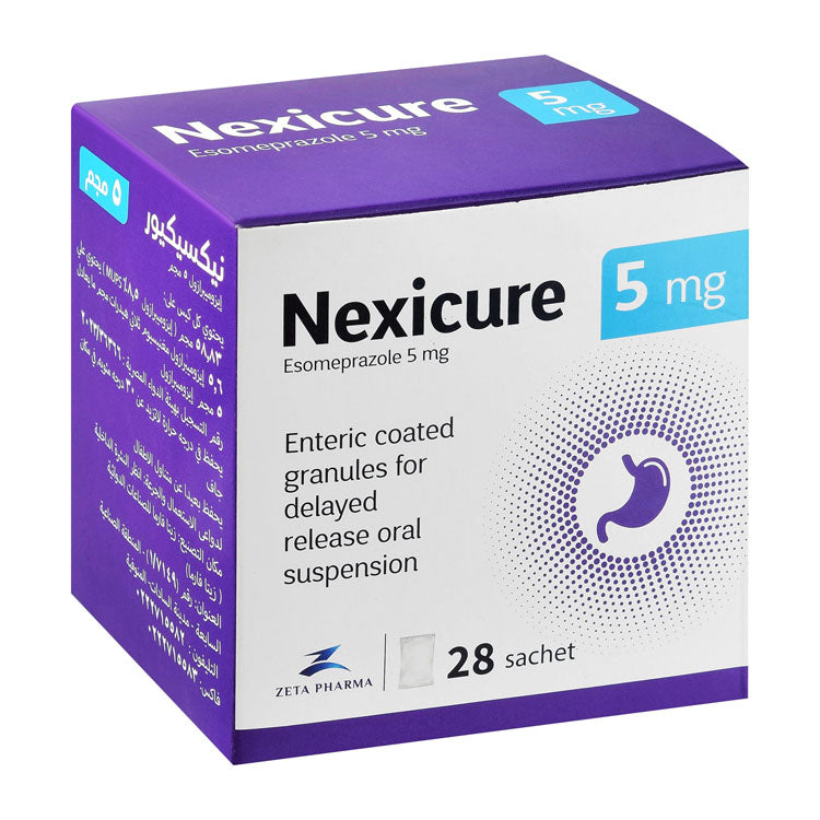 أكياس حبيبات نيكسيور 5 ملجم إيزوميبرازول المعلقة عن طريق الفم مُعدة لتقليل إنتاج حمض المعدة، مما يوفر الراحة من حالات مثل ارتجاع المريء وحرقة المعدة.