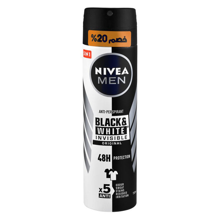 بخاخ مزيل العرق ومضاد التعرق الخفي، بتركيبة خاصة للرجال لمنع العلامات البيضاء على الملابس السوداء والبقع الصفراء على الملابس البيضاء، ويوفر حماية فعالة ضد العرق والرائحة.