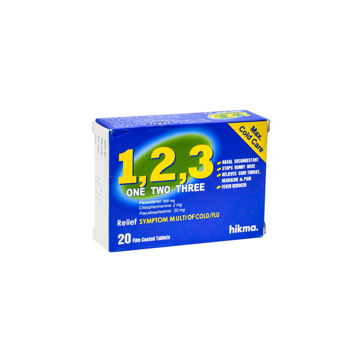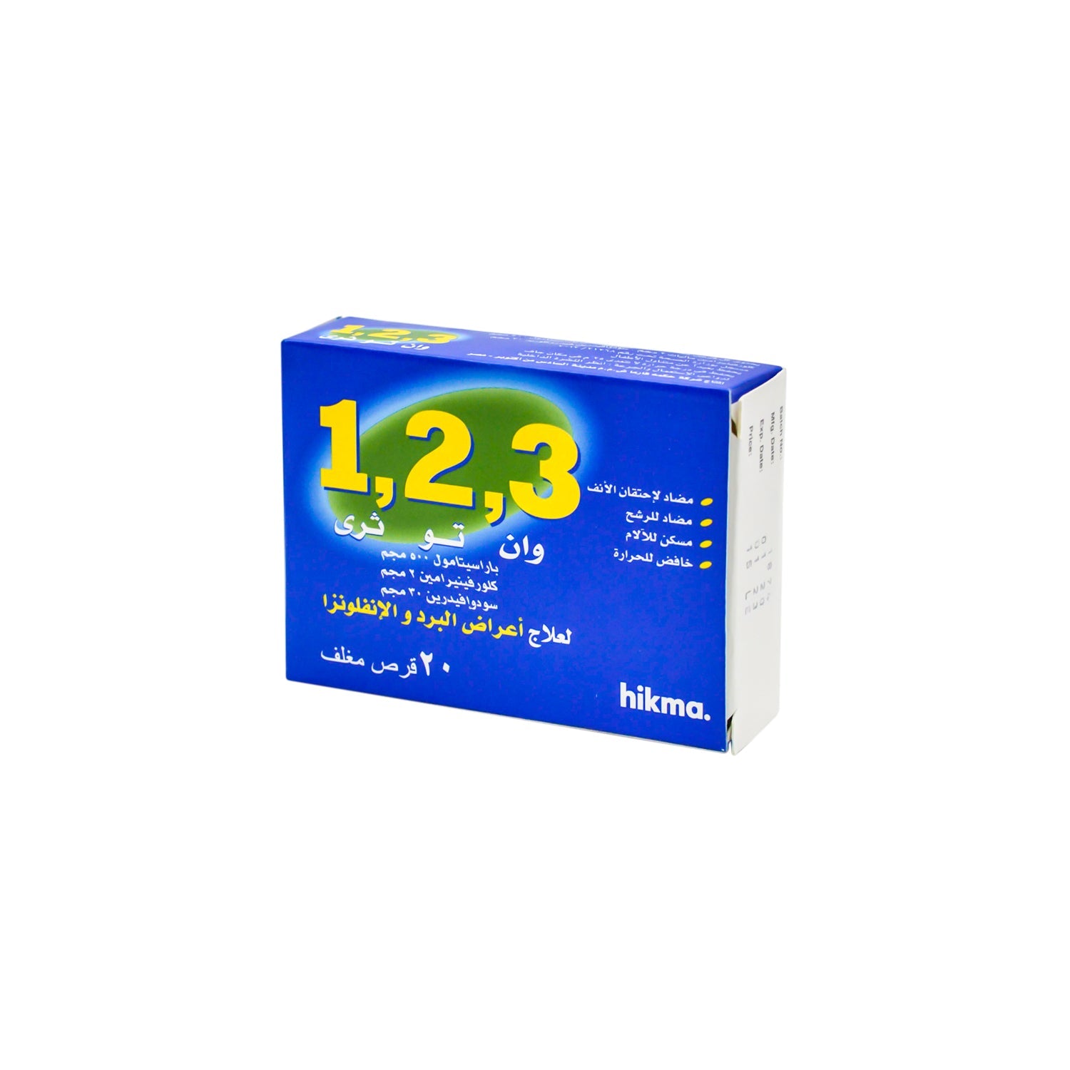 • 1،2،3 500 ملغ باراسيتامول، 2 ملغ كلورفينيرامين و30 ملغ سودوإيفيدرين دواء لتخفيف أعراض البرد والإنفلونزا