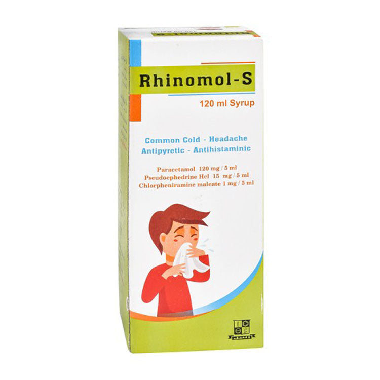 شراب راينومول-إس لعلاج نزلات البرد، يحتوي على 120 ملغ باراسيتامول، 15 ملغ هيدروكلوريد السودوإيفيدرين، و1 ملغ ماليات الكلورفينيرامين