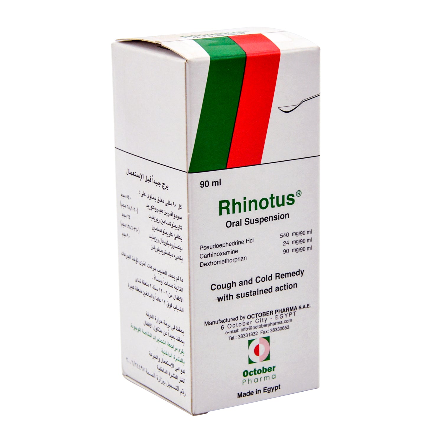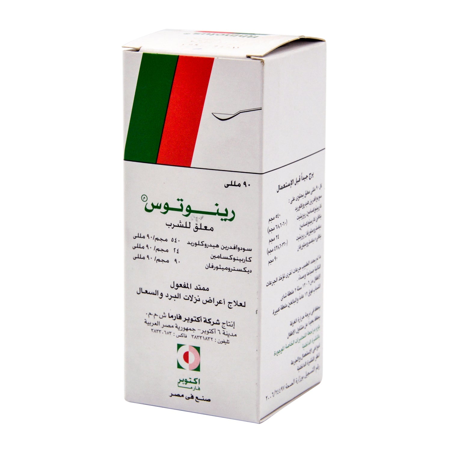 معلق فموي من رينوتوس يحتوي على 540 ملغ من هيدروكلوريد السودوإيفيدرين، و24 ملغ من كاربينوكسامين، و90 ملغ من ديكستروميثورفان، لتخفيف السعال ونزلات البرد
