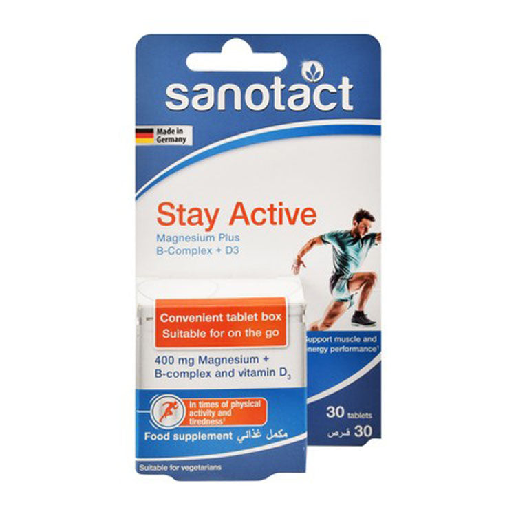 يحتوي هذا المكمل الغذائي سانوتاكت ستاي أكتيف على 400 ملجم من المغنيسيوم بالإضافة إلى فيتامينات ب المركبة وفيتامين د3 لدعم وظيفة العضلات واستقلاب الطاقة.