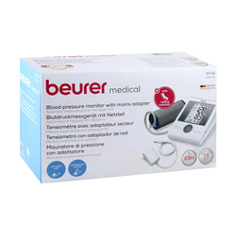 The Beurer BM 28 is an upper arm blood pressure monitor designed for accurate and convenient measurement of blood pressure, accompanied by a main adaptor for power.