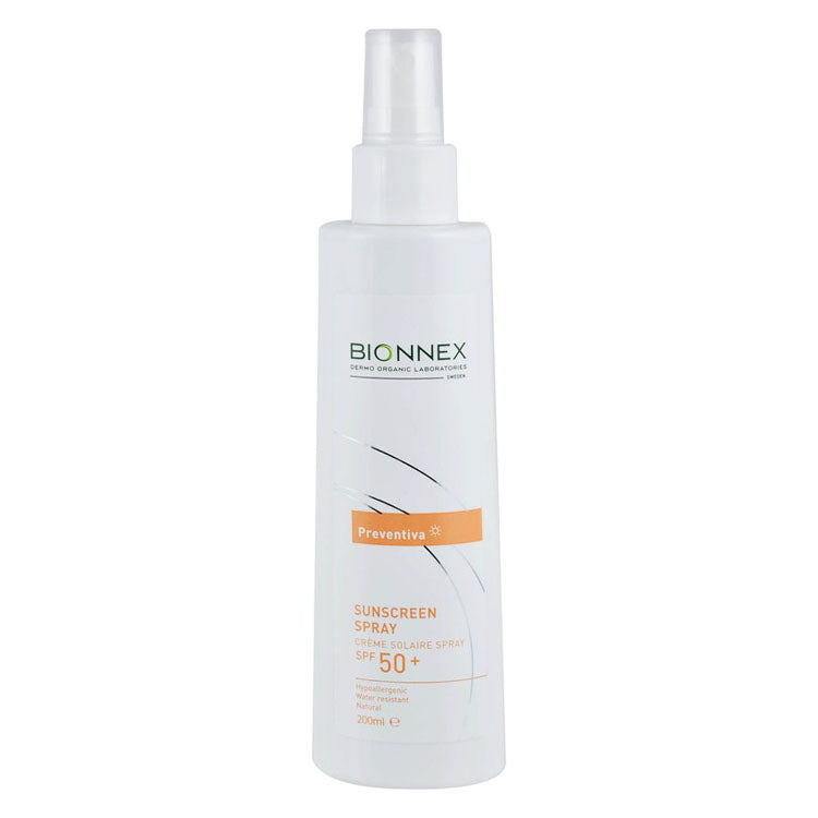This is an organic, hypoallergenic, water-resistant sunscreen spray offering SPF50+ protection for both face and body, formulated without parabens, perfume, or dyes, making it suitable for all skin types.