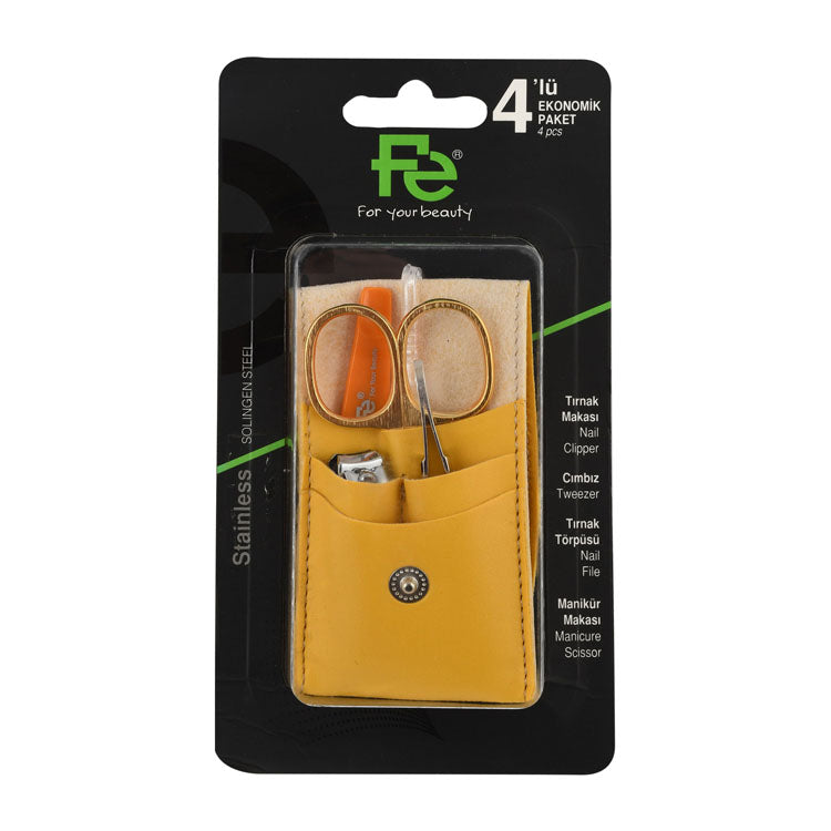 A comprehensive personal grooming kit featuring durable stainless steel tools elegantly presented in a distinctive yellow leather case.