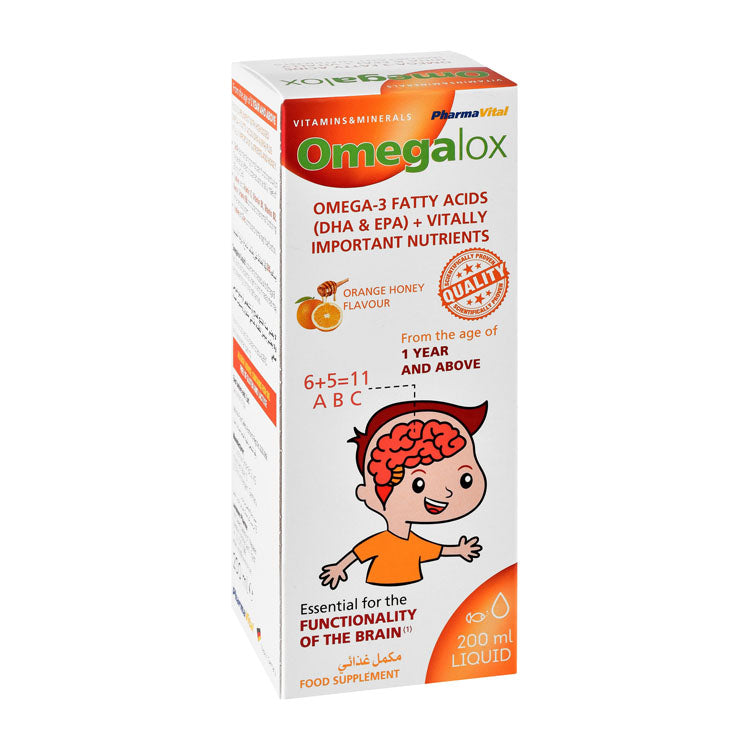 This Pharmavital Omegalox liquid supplement provides 305mg of Omega 3 to support brain function in children aged 1 year and older, featuring a pleasant orange and honey flavor and free from gluten and lactose.
