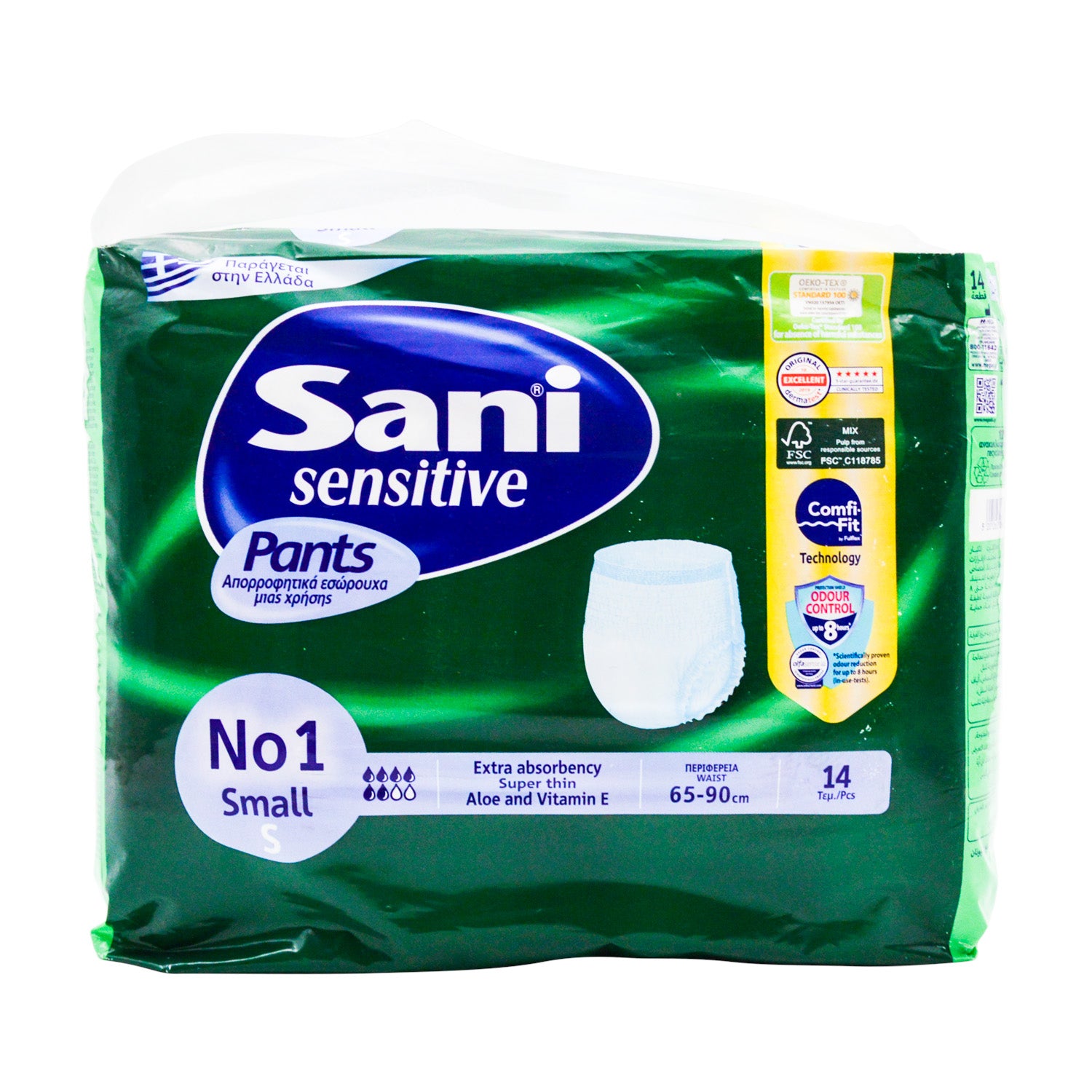 Sani Sensitive Small Adult Diaper Pants provide discreet and comfortable incontinence protection, enriched with Aloe and Vitamin E for skin health.