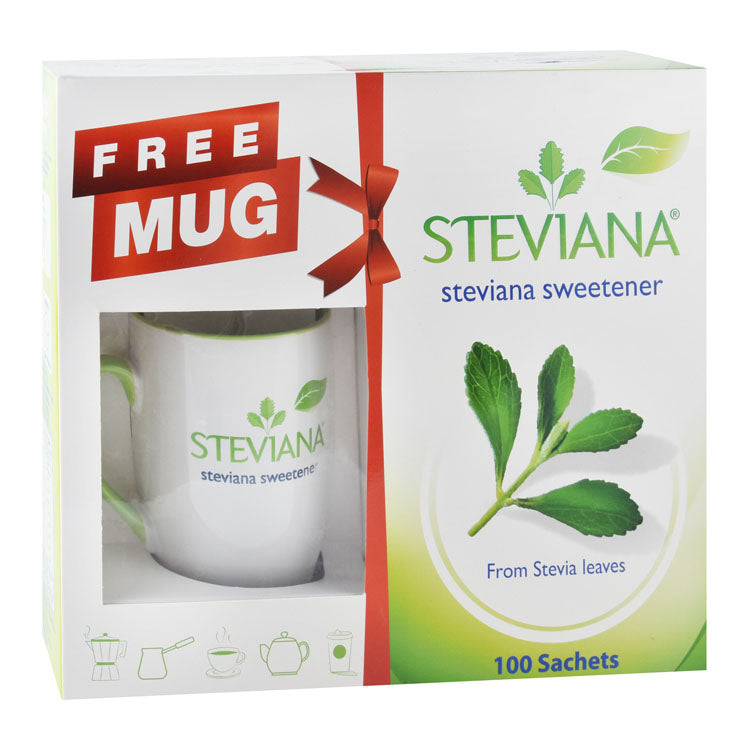 Steviana Sweetener offers a sugar substitute option for various dietary needs, presented with a complimentary mug as a promotional bonus.