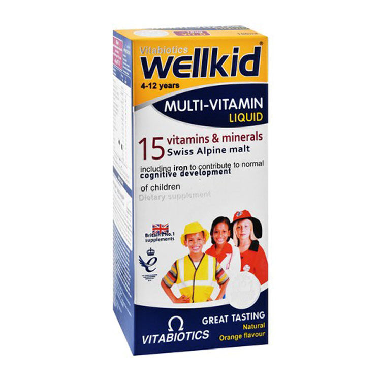 Vitabiotics Wellkid Multivitamin & Mineral Cognitive Support Liquid Supplement Orange Flavor (4-12 Years) - dairy free, alcohol free, lactose free
