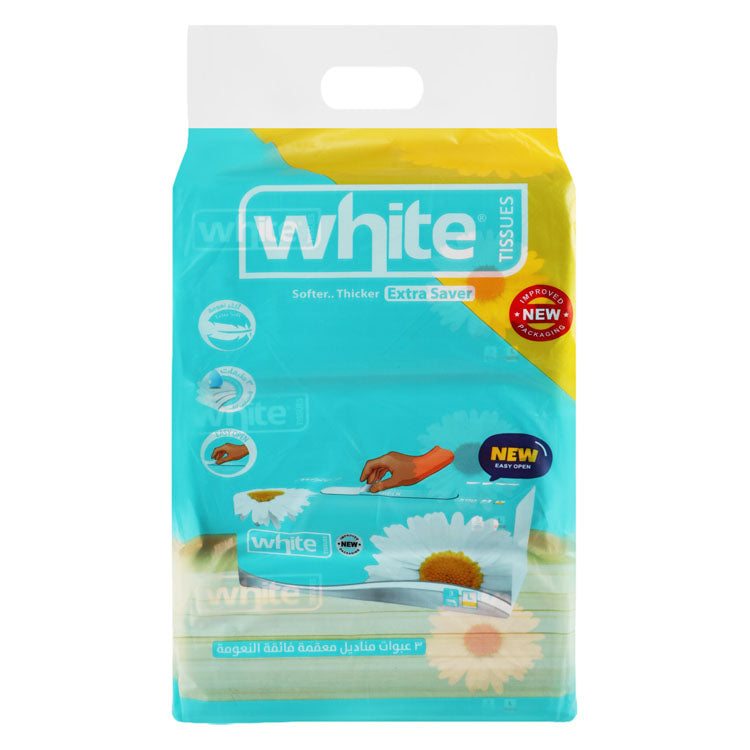 Large, 3-ply, white facial tissues designed for general hygiene and personal care, offering sterility for sensitive applications.